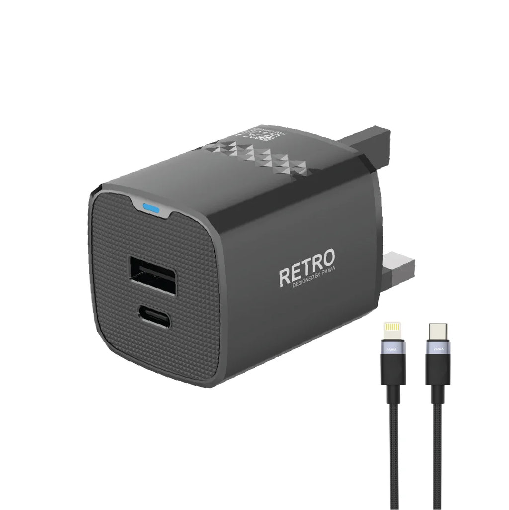 Retro 25W PD+QC UK Charger With USB-C to Lightning Cable - بلاك شاحن حائط + سلك شحن ايفون - 25 واط - باوا - كفالة 12 شهر
